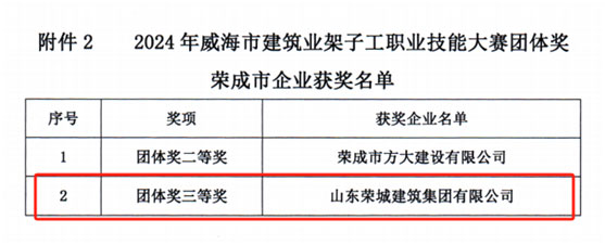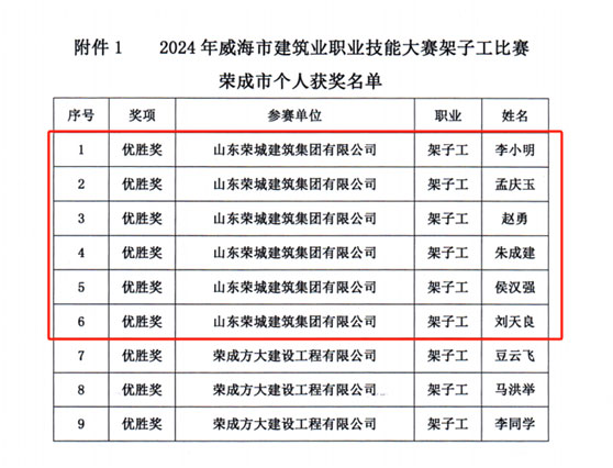 2024年6月21日,由威海市人力资源和社会保障局、威海市总工会、威海市住房和城乡建设局主办,威海市建筑工程服务中心、临港区住房和城乡建设局、威海市建筑业协会承办的2024年度威海市建筑业架子工职业技能大赛在环翠区万禾书院项目部举行。比赛现场,23支队伍的69名参赛选手穿着整齐的工作服,头戴安全帽,身着工服,精神饱满,动作娴熟,有条不紊的进行一系列工艺操作,展示着扎实的专业功底和丰富的技能经验。经过数小时的激烈角逐,我司架子工代表李小明、孟庆玉、赵勇、朱成建、侯汉强、刘天良获得优胜奖,公司获得团体三等奖的好成绩。
